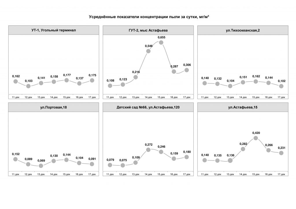 В период с 15 по 21 апреля в Находкинском морском торговом порту среднесуточного превышения норм запыленности воздуха не фиксировалось.