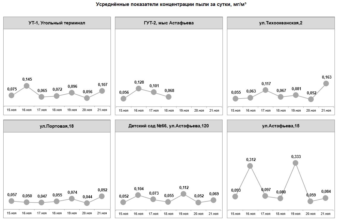 С 16 по 22 октября превышение норм запыленности воздуха не фиксировалось. Показания датчиков составляли от 0,032 до 0,136 мг/м3.