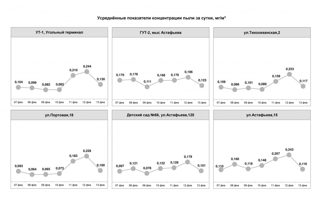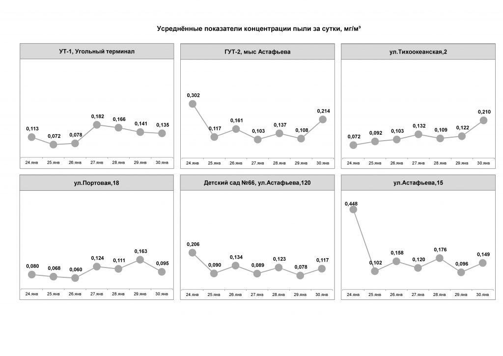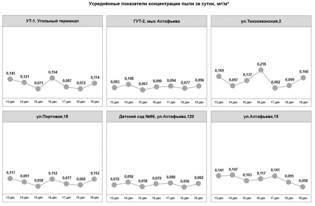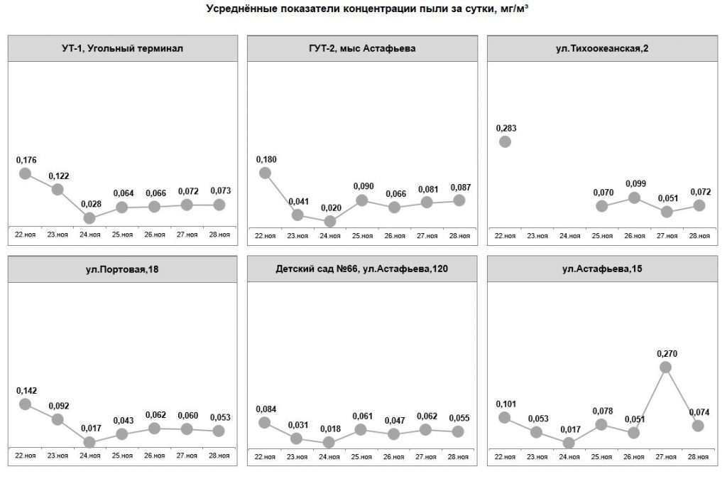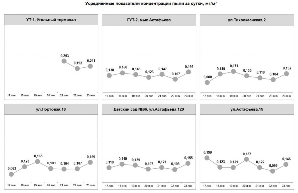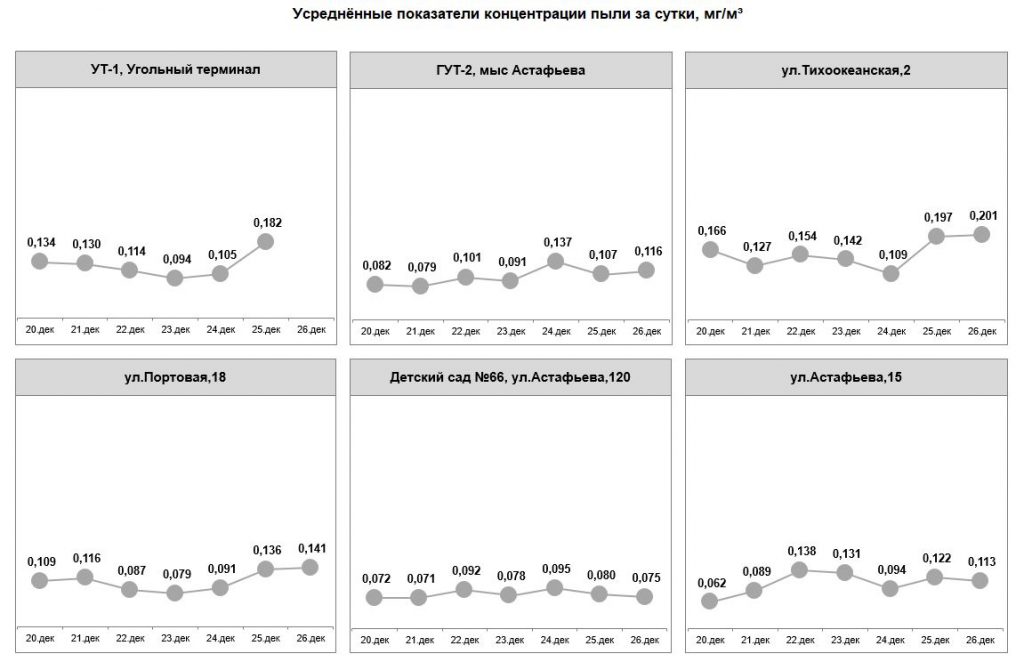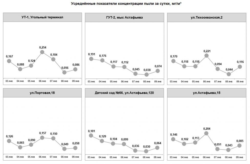 С 19 по 25 июня превышение норм запыленности воздуха не фиксировалось. Показания датчиков составляли от 0,010 до 0,083 мг/м3. В настоящее время в порту возведены ветропылезащитные экраны, работают стационарные и мобильные водяные пушки. В ежедневном режиме на территории порта проводится уборка с помощью специализированной техники (эксплуатируется вакуумная подметально-уборочная машина, 7 поливомоечных машин, 13 мини-погрузчиков). При поливе территории используется раствор пылеулавливающего реагента «Бишофит», орошение угольных штабелей производится специальным раствором целлюлозы, который препятствует рассеиванию угольной пыли в воздухе.