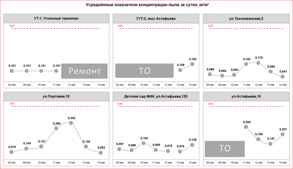 За минувший период, с 11 по 15 января по данным приборов, установленных на границе предприятия и СЗЗ, концентрация пыли в атмосферном воздухе в период проведения измерений не превышала предельно-допустимую концентрацию.