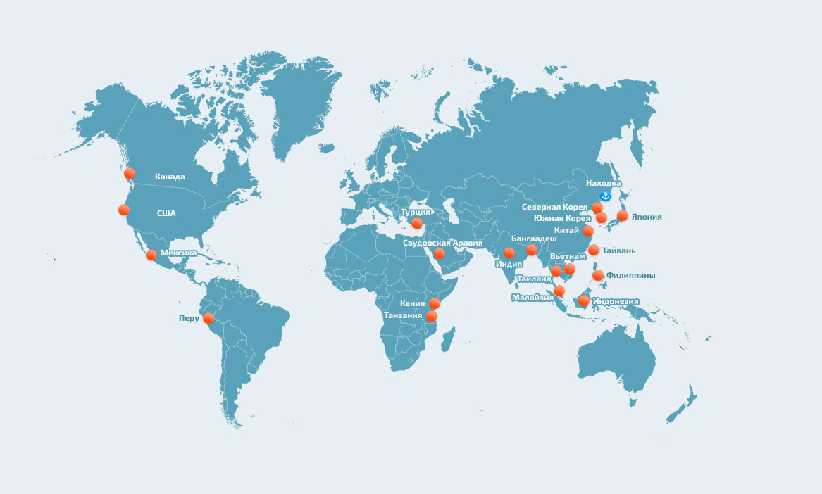 Широкая география поставок продукции из Находкинского морского торгового порта охватывает не только российские территории, но и страны Азиатско-Тихоокеанского региона. От причалов порта грузы отправляются в Китай, Японию, Северную Корею, Южную Корею, Индонезию, Индию, на Тайвань, в Таиланд, Вьетнам, Бангладеш, Малайзию, Филиппины, а также в США, Канаду, Мексику, Перу, Саудовскую Аравию, Турцию и страны Африки (Кению, Танзанию).