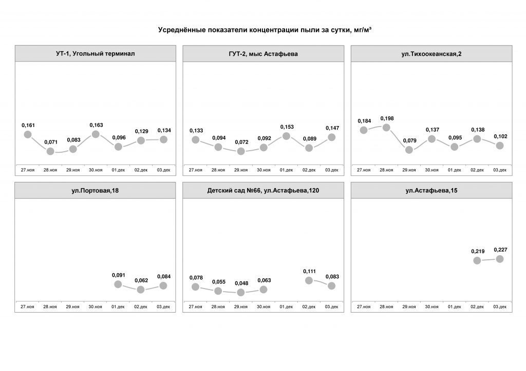 С 27 ноября по 3 декабря превышение норм запыленности воздуха не фиксировалось. Показания датчиков составляли от 0,048 до 0,227 мг/м3.